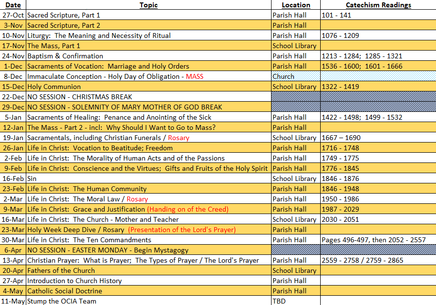 At OCIA, we are blessed to have several speakers support the efforts of our catechumens and candidates as they prepare for the sacraments of initiation at the Easter Vigil. You too are invited to join us to learn more about your faith.